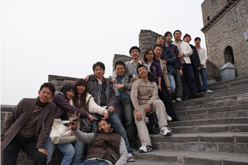 第三天,我們雄心壯志地向長城出發(fā),小時候就讀著:不到長城非好漢的詞句,這次我們來到了長城,也要做一個真正的好漢。人很多,男的,女的,黃頭發(fā)的,黑頭發(fā)的,到了這里,不分民族種族,只有好漢。長城的階梯很抖,很多人都需要借助兩邊的扶手往上爬。剛上第一個鋒火臺的時候,階梯比較寬,人也多,到了第二個的時候,人稍少了點,到了第三個以后,階梯更抖,人也少了很多,因為天氣太冷,很多人就只好在下面往上看了,但我們方舟公司的姑娘小伙們,有一種登上高處我為峰的感覺,繼續(xù)往向爬,在半山的時候,居然下起了毛毛雪,十月的天,從廣州去到北京,居然看見了雪,雖然很小,但足以讓人興奮不已,還未爬上頂?shù)膉ason和tango,本想打消爬到頂峰的念頭,但想到可能上面的雪會下得更大,于是,一種“遠(yuǎn)處的風(fēng)景更美”的力量吸引著他倆一鼓作氣爬到了最高峰,還和大家一起在長城的最高峰合影呢,看,這就是方舟公司的好漢們: