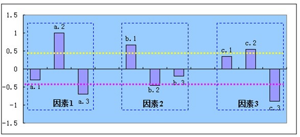 其中,黃色虛線以上的三個(gè)因素水平,代表了屬性間最佳的組合(a.2、b.1、c.2),而紅色虛線以下,則代表了市場(chǎng)接受度最差的組合(a.3、b.2、c.3)。