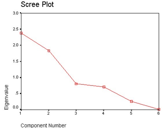 從方程中我們可以歸納出:第1因子主要由“地段、質量、價格”決定,所以我們可以稱之為“傳統(tǒng)價值因子”;第2個因子主要由“小區(qū)環(huán)境、社區(qū)文化、周圍環(huán)境”決定,均與環(huán)境密切相關,因此我們稱之為“環(huán)境因子”,相應碎石圖為: